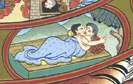 Now this automatically produces the grasping at the fruit. That is to say, if a thing is pleasant enough for you, not only do you want to re-experience it, but you want to guarantee that you re-experience it, and therefore, you wish to possess it. Again it follows quite logically from the [37:40] contact of the senses and affective response, I like-dislike, I move toward the likes, I would like to have them again, and to guarantee I have them again, I would like to own them. This brings us to the picture showing sexual union of a man and a woman.