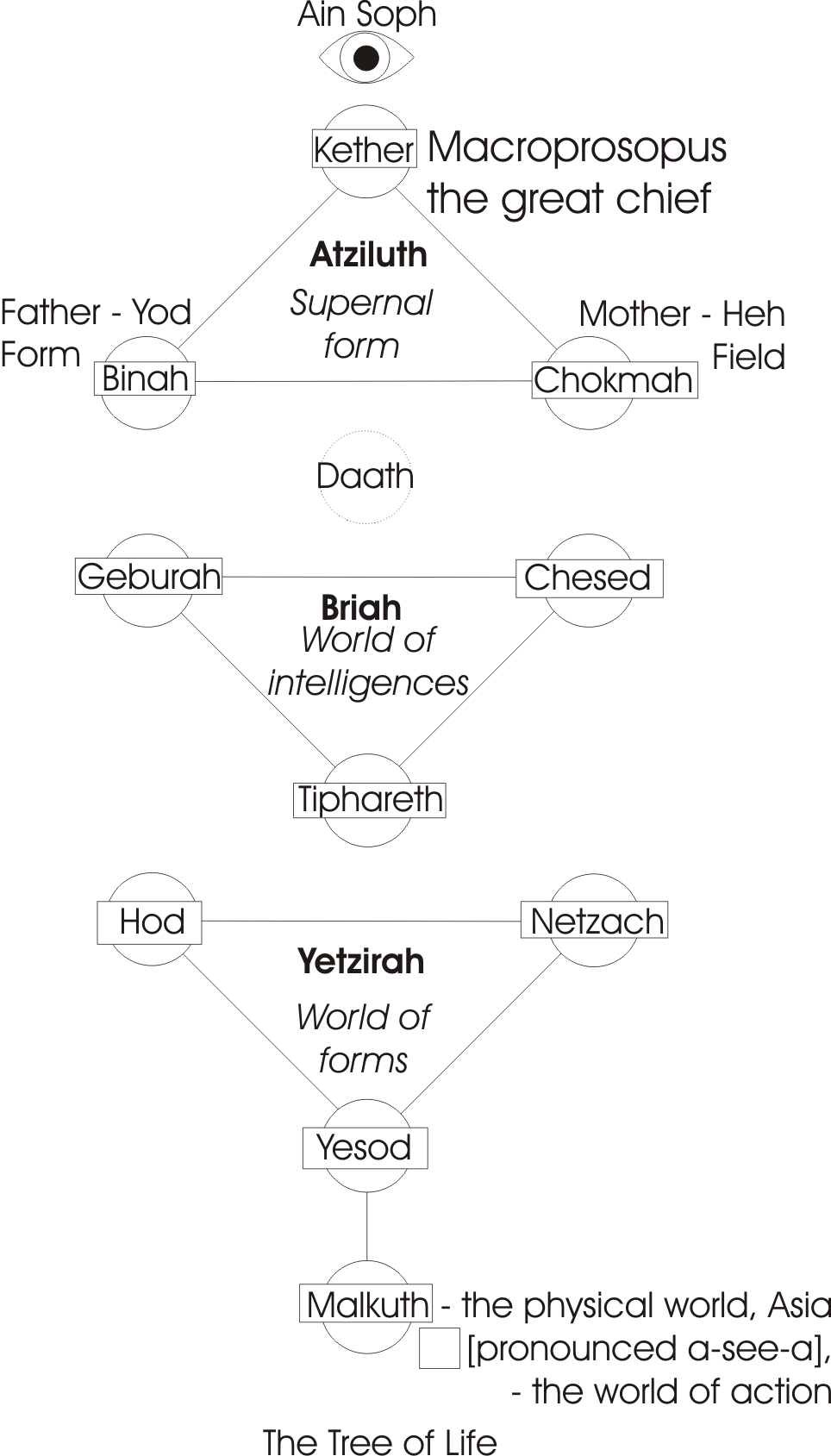 Now, in order to consider being at all, we have to start below that, and we start with the thing called the crown Kether in the Qabalah. This is the crown above which there is no thing, but the Absolute Wisdom is hidden in that no thing. And it appears in this crown, and this crown is called — we’ve had it before — Big Head, White Head, Macroprosopus ... the Great Chief. And he polarises himself as father, and as mother of the universe. And that completes the top triad.