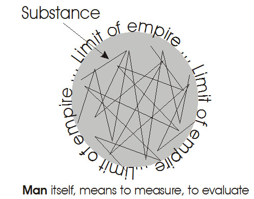 There’s our centre and we just go round the circle with pi, in the earth now-and-now, instead of by-and-by. The limit to which our authority goes is called the limit of empire, and it is initially built by piracy ... that is, by men running out and raiding the perimeter of their own zone, and then subjecting peoples all here [in the substance] to law.