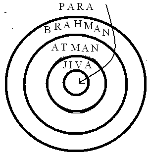 Now we have to remember the jiva,,that is, your empiric egoic self, the atman, that’s your true spiritual self separated only by a very thin membrane from the Brahman, which is the great Cosmic Self, and the Parabahman goes beyond all that and at the same time, permeates every layer within it. The Parabahman penetrates the Brahman, the Brahman with the Parabrahman penetrates the atman, the atman penetrates the jiva, the individual, empirical ego and that thing penetrates nothing unless it gets down to using swords, daggers, guns and so on, in a contingent relation with other identified, egoic structures.