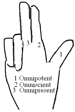 Now, we are going to pass from that simple non-dualism to this question of God. How do we define God as infinitely, powerful, wise, active? We say God is power, form, function. Power, that which pushes itself about; form, that which shapes itself; function or activity, that which causes it to express itself in the actual world of phenomena, Power, Form, Function. As a mnemonic you make the sign of power, the manual of power, you hold your little finger and ring finger down and you hold the other three up, and on the thumb you place power, on the index finger form, on the middle finger activation or function or actualisation, power, form, function. When you make that sign, it is called the manual of power. It is to remind you of this fact that you cannot have an absolute dualism. So, if power can interact with form, or the will with an idea, then they cannot, ultimately be different. If this power and the idea can go into actuality, then actuality is not different from power-form or formulated power.