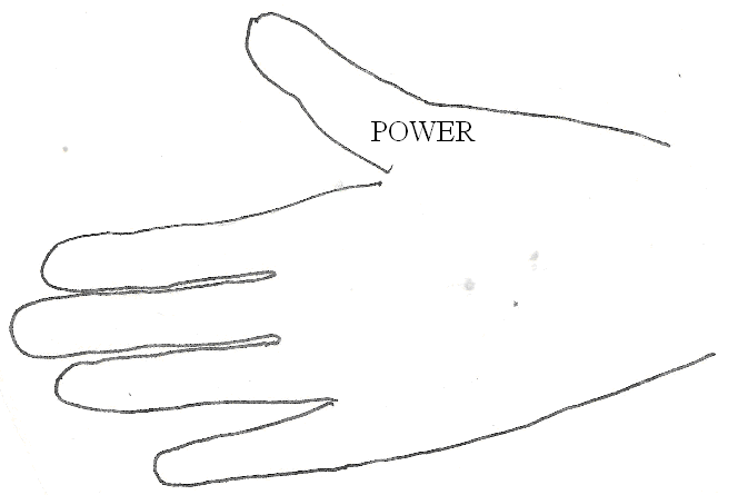 Now, if we make a mnemonic of the process we can draw ourselves a primitive type hand, neo-primitive hands cost forty thousand pounds when well painted! The thumb we are going to call power and I want to use this word power here in a special way. The etymology of that word ‘power’ actually comes from a word from which we get the word ‘push’ and the word ‘wer’ which means ‘man,’ whether you spell it Latin-wise, VIR, or Teutonic-wise, WER as in werewolf, it is the same word, power and man, push-man. You push things with your thumb. But we must distinguish between the use of the word power in philosophy from the use of the word power when you are considering problems in physics and mechanics and so on. Power as a rate of work done is not what we are talking about. We are talking about push, that which produces motion and which is inherent in ultimate reality.